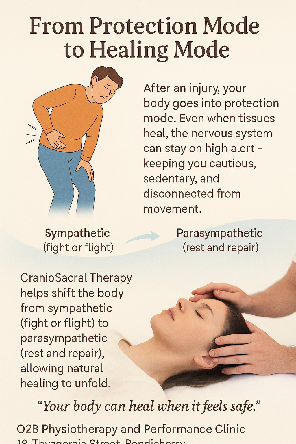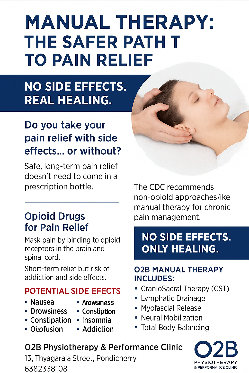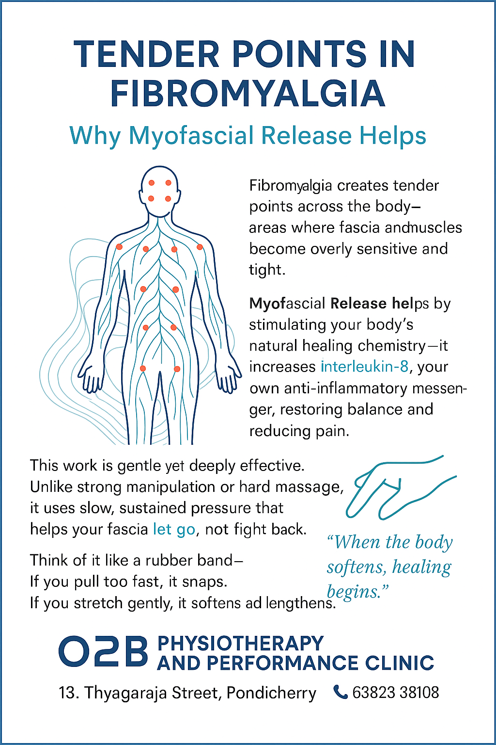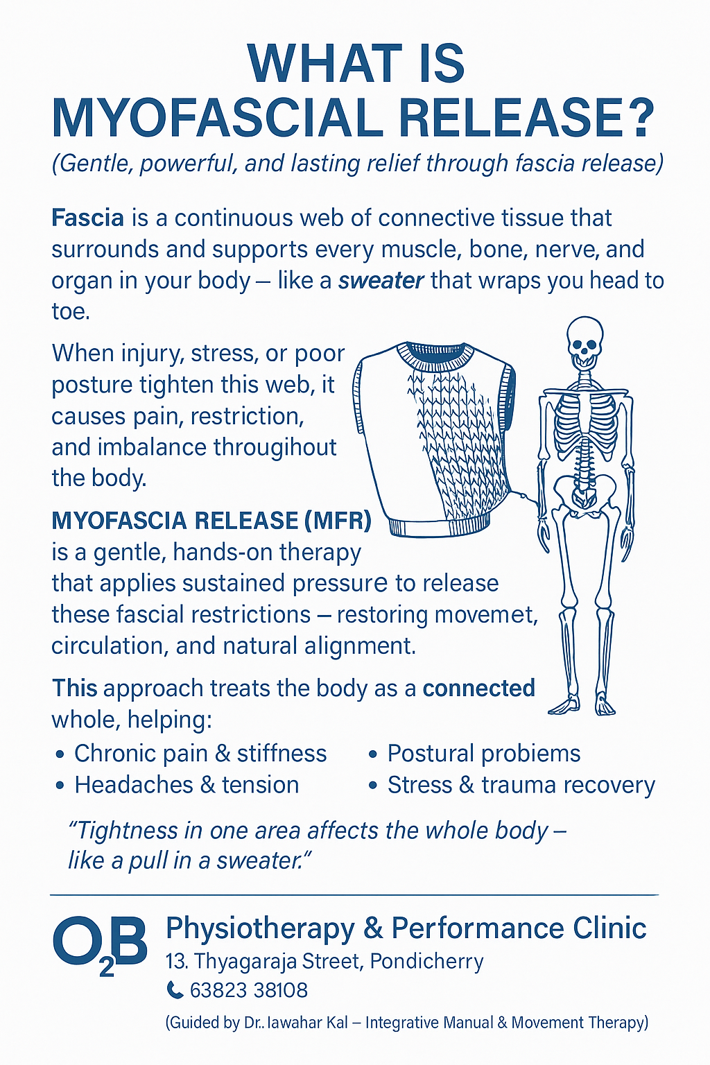 O2B Clinic provides a fascia-based, holistic physiotherapy approach focused on identifying and treating the root cause of pain rather than temporary symptom relief. We specialize in chronic pain, neck pain, back pain, postural problems, and movement-related conditions using safe, gentle, non-forceful techniques. Treatment is designed to last long by restoring tissue adaptability, nervous system balance, and efficient movement patterns. Care is delivered through a structured clinical system, where therapists follow defined treatment pathways with doctor review, progress correction, and decision-making at key stages of recovery. If you are looking for physiotherapy that is safe, precise, and focused on long-term improvement,O2B here to help.